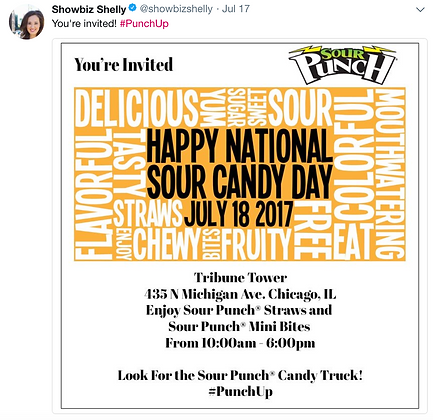 July 17, 2017: Popular Chicago radio host, Showbiz Shelly from B96 agreed to post about Sour Punch's event for National Sour Candy Day on her twitter account. This post reached 17.4K followers.